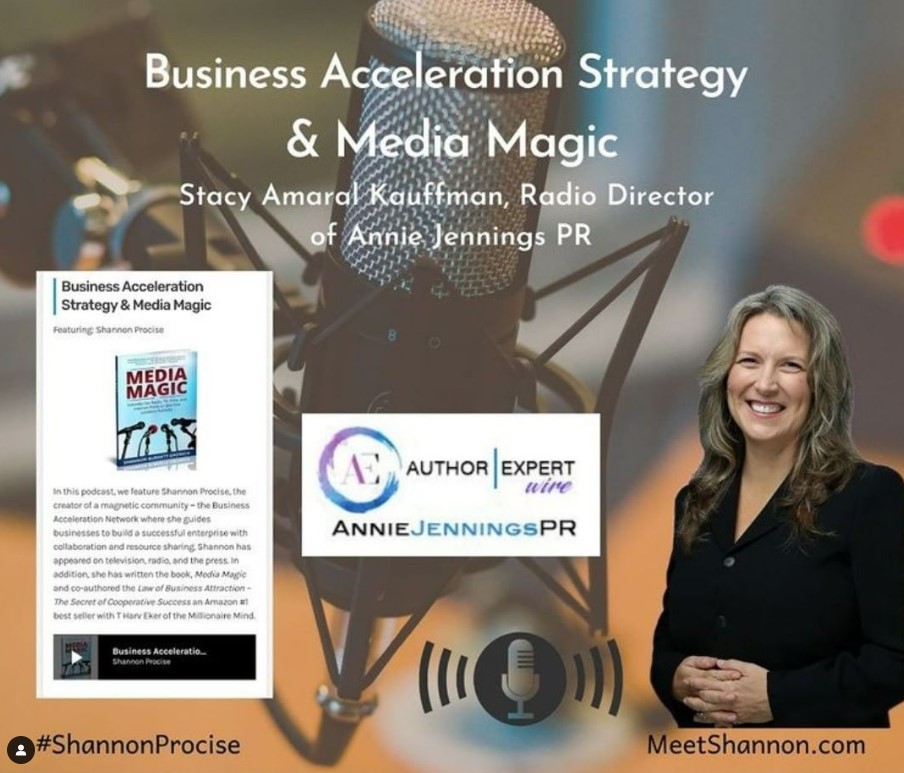In this podcast, we feature Shannon Procise, the creator of a magnetic community ? the Business Acceleration Network where she guides businesses to build a successful enterprise with collaboration and resource sharing. Shannon has appeared on television, radio, and in the press. In addition, she has written the book, Media Magic and co-authored the Law of Business Attraction ? The Secret of Cooperative Success an Amazon #1 best seller with T Harv Eker of the Millionaire Mind.
