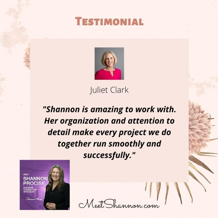 "Shannon is amazing to work with. Her organization and attention to detail make every project we do together run smoothly and successfully." - Juliet Clark